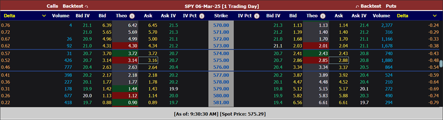 もう一例みてみよう。翌週3月6日でやってみる。株価に近い権利行使価格は575ドルだ。C575は3.15ドル、P575は2.87ドルで買えるだろう(図表6)。支払総額は6.02ドル(実際は602ドル)だ。