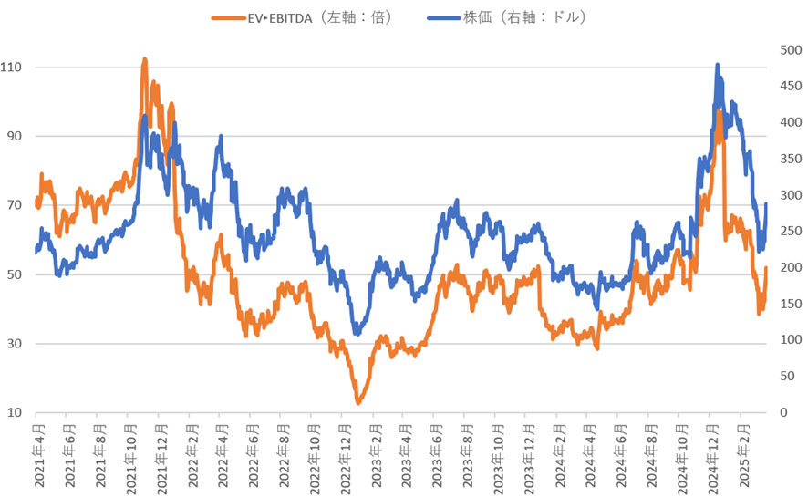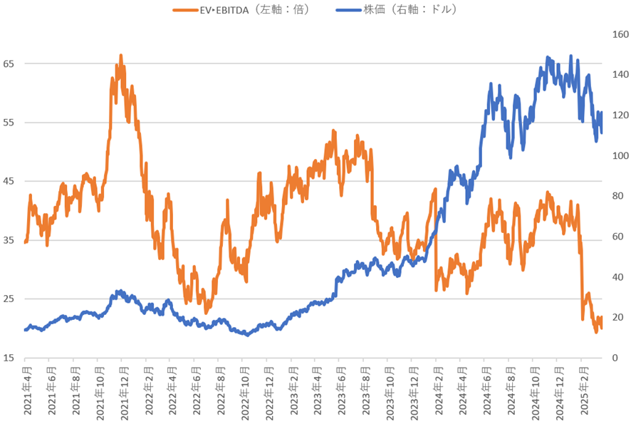次にPEGレシオで数値が高かったテスラについて、EV/EVITDAで見るとこちら。