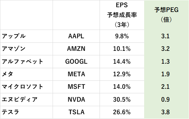 マグニフィセント・セブンのような、高成長企業の株価の割安・割高をはかるためには、PER(株価収益率)だけでは物足りません。なぜなら、予想PERで使用される業績予想は今期のものであって、企業が行なう設備投資や複数年にわたる事業計画の将来性を踏まえることが出来ないから。