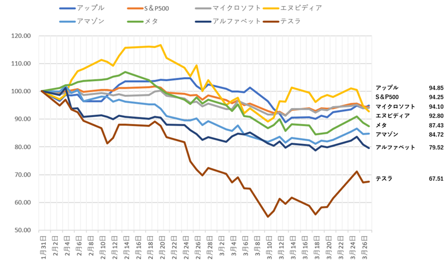 2月以降のマグニフィセント・セブンの推移(3月27日時点。1月末=100)
