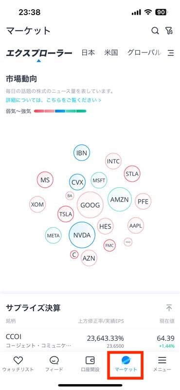 エクスプローラーは市場動向(マーケットバズ)から買うべき銘柄、売るべき銘柄を見つけることもできます。市場動向、つまりどの銘柄が市場で話題になっているのかを視覚的に表しているのがマーケットバズです。