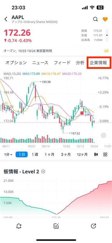 株式詳細ページを見るには、🔍を押し銘柄名またはティッカーを入力してください。ティッカーとは会社を表す略号で、通常1〜5文字で構成されます。お目当ての株式のティッカーシンボルをご存知の場合は検索欄に入力してください。