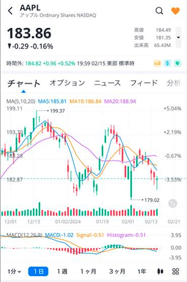 その株価の動きを記録したものが株価チャートです。銘柄ページの株価の下に表示され、チャートをダブルタップすることで、大きく表示することができます。