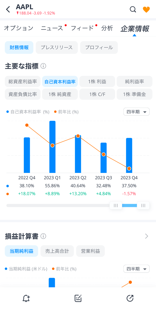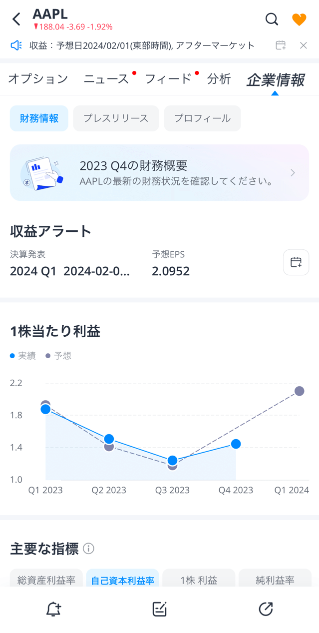 財務情報ではEPS(1株当たり利益)の四半期毎の予想と推移、ROE(自己資本利益率)などの主要な財務指標の推移も視覚的に分かりやすくチェックできます。