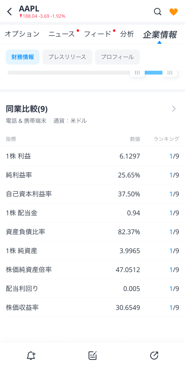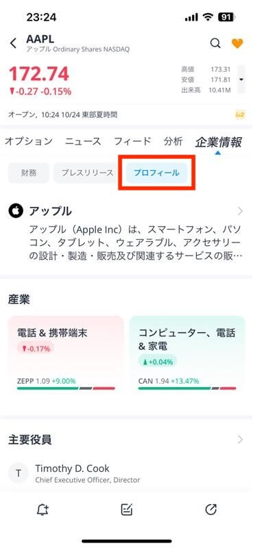 まず投資する企業が何をやっているのかが気になると思います。そこで「企業情報」をタップし、次に「プロフィール」をタップして個別企業のページで確認しましょう。ここでは、どのような製品・サービスを展開しているのか、その企業がどの業種に属すのか確認できます。