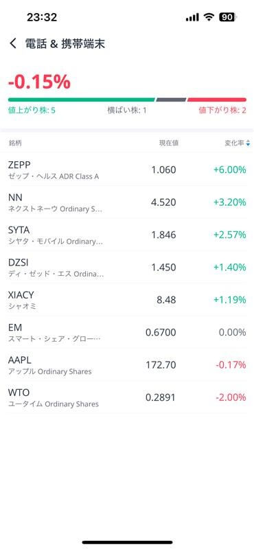 「産業」の欄からその銘柄の業種をタップすると、その業種の当日の騰落率や値上がり・値下がり銘柄数、その業種に属する同業他社の株価動向もチェックできます。